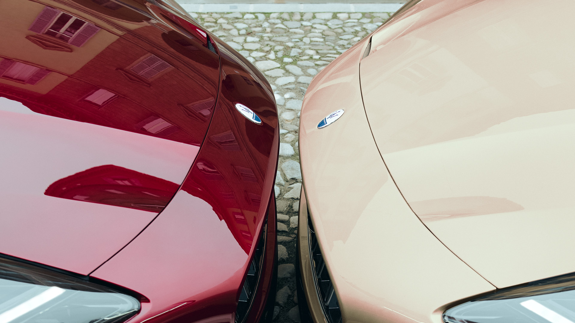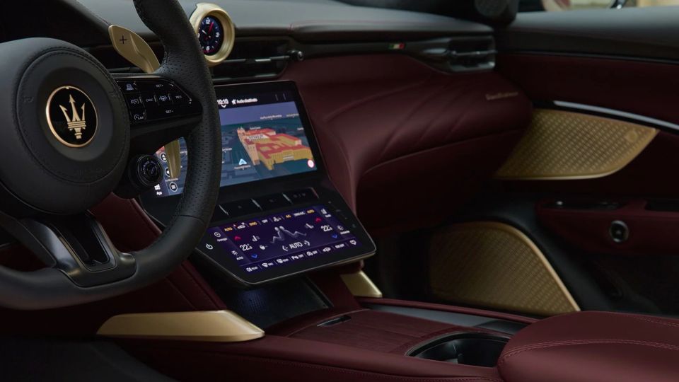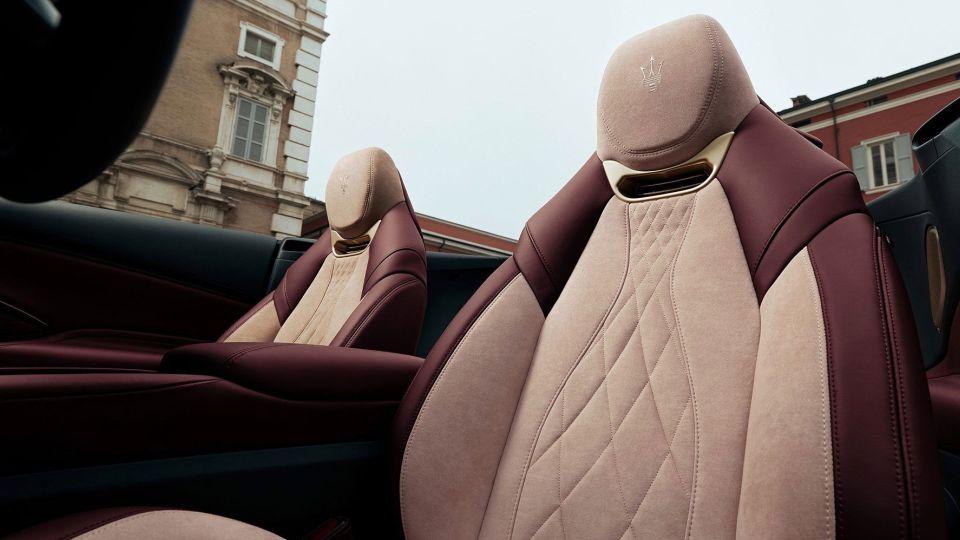 GranTurismo 披上名為 Rosso Velluto 的多層次紅色塗裝,靈感來自劇院天鵝絨座椅與紅色帷幕,在光線流轉間展現深邃而戲劇化的變化;GranCabrio 則以 Oro Lirico 香檳金色呈現,溫潤色澤中隱含紅色光暈,呼應歌劇院鍍金裝飾的優雅與歷史感。細節之中,輪圈、徽飾與三叉戟標誌皆重新詮釋為金色語彙,將奢華、工藝與現代科技凝鍊為一致而從容的視覺節奏。