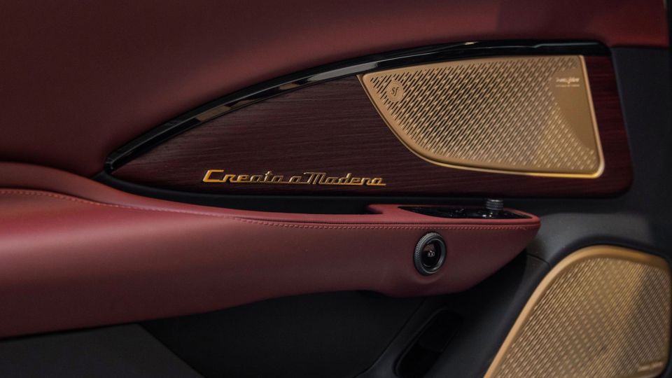 座艙空間同樣延續歌劇院的沉浸體驗。內裝首次結合皮革與 Alcantara 材質,訂製酒紅色皮革搭配柔軟的 Nude 色 Alcantara,如同置身劇院包廂之中。手工金色塗裝飾件、Sonus faber 音響格柵與紅色染色楊木飾板,共同構築出溫潤而層次豐富的空間氛圍。駕駛座門板上的「Creata a Modena」徽章,低調卻明確地標示出這份來自 Emilian 土地的驕傲。